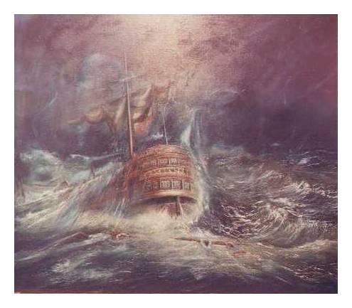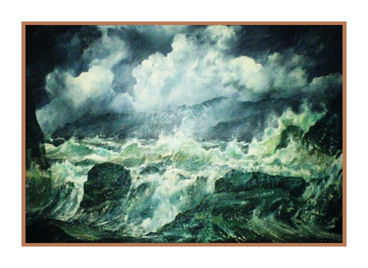 This first photograph of an A.J.Godden original oil painting of a Sailing Ship in Rough Sea's off Cape Horn shows Alec's artistic imagination and mastery with a brush on canvas.  The second picture is an oil painting of a rough turbulent sea crashing to the rocky shore.