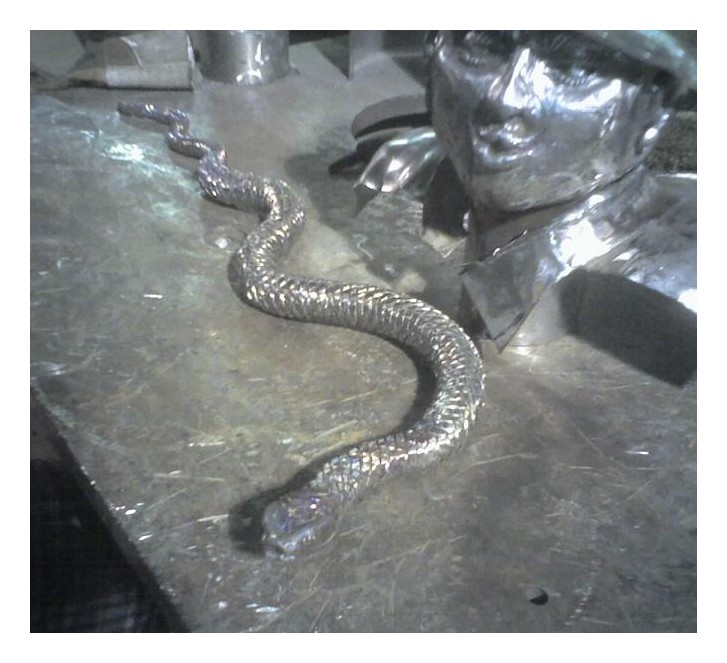 Stainless steel is the medium of choice although deadly to weld and work with and rather expensive material, this welded sculptured snake and bust of an Irish whister will never age and tarnish or depreciate artistically in value.
