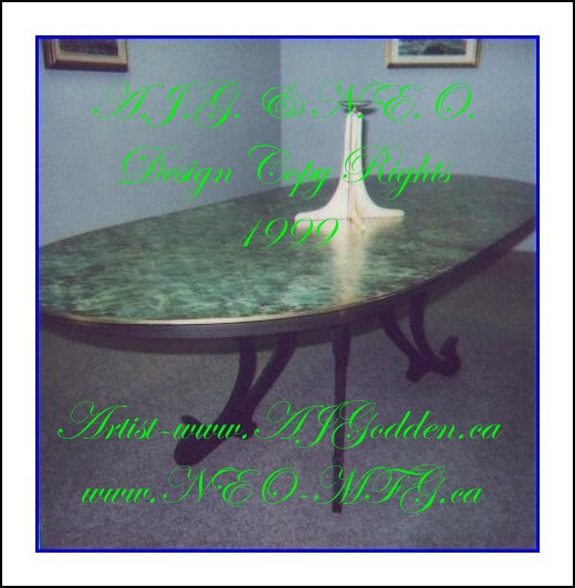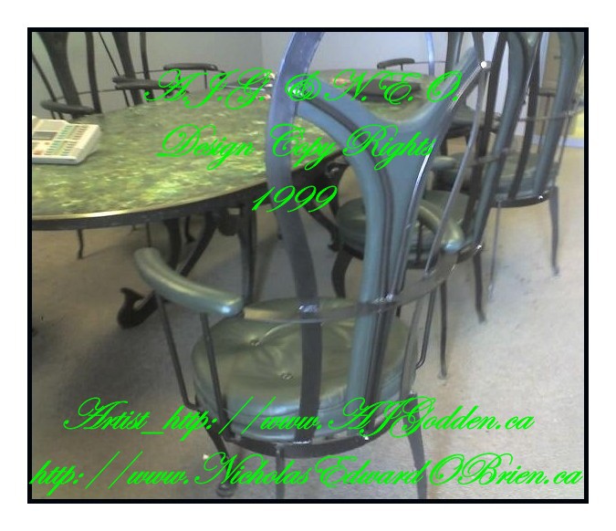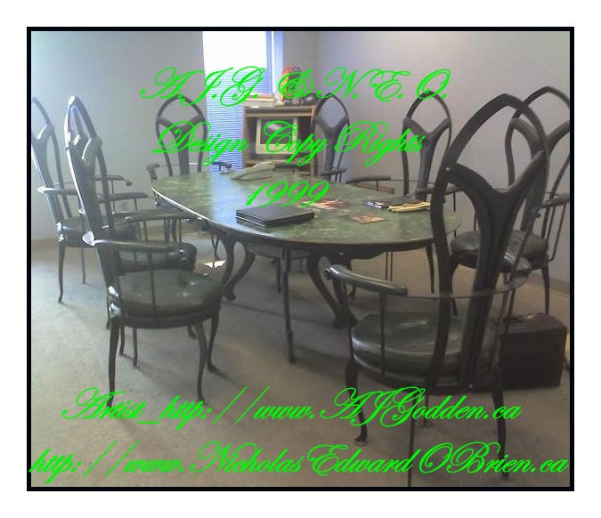 These pictures below show Alec's designs for the conference room, first a 3/8" patina finished bronze plate table, with oxy flame cut 1-1/4" custom designed legs. Next are 8 medievil high back styled, green leather upholstered chairs, all custom made to Bruce's own specifications, and situated in the AJ memorial room at head office of Charles Jones Industrial Ontario.. |