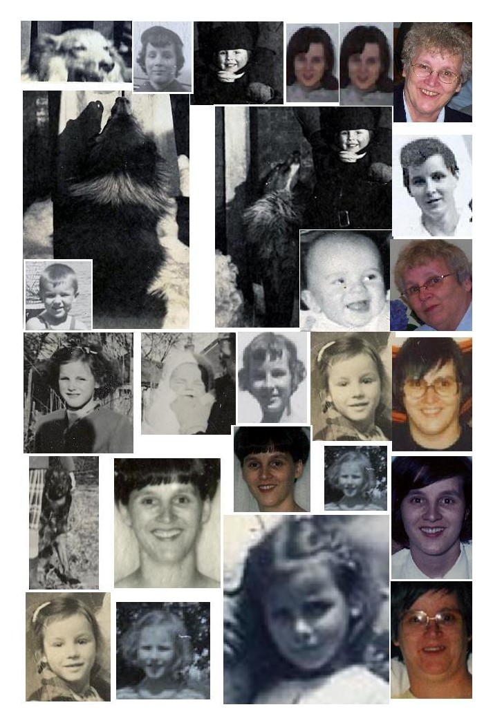 A collage of photo's of Diane at many ages including Laddie her dog and her nephew baby Nickie