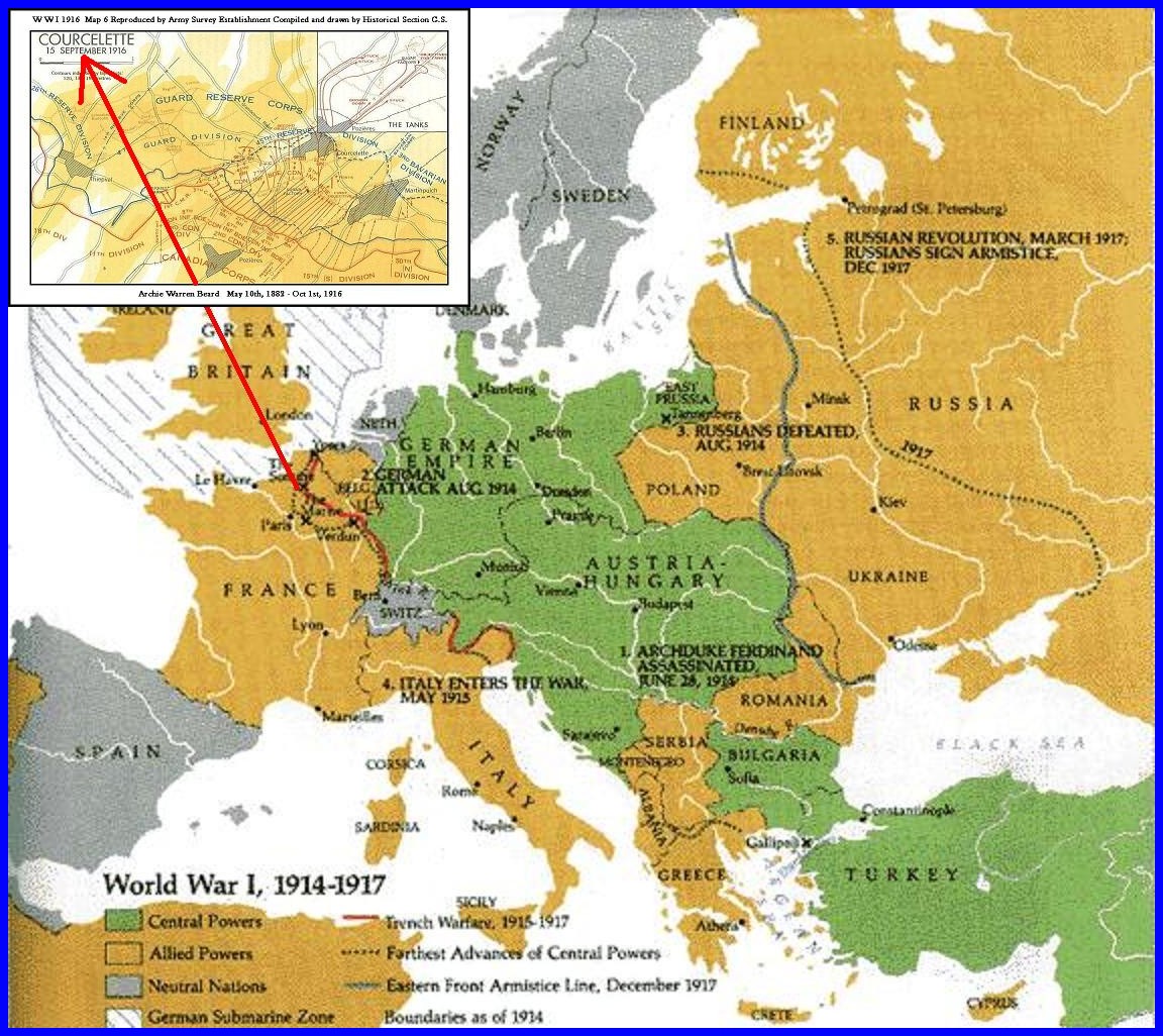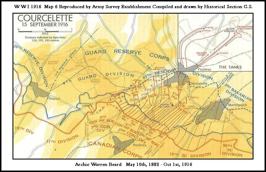 Tribute Websites to Archie Warren Beard: Please Cick on the ''Links'' below ''MiltonHistoricalSociety.ca''; ''Veterans.gc.ca''; ''CWGC.org/BEARD-ARCHIE-WARREN''; ''CanadianGreatWarproject.com/soldier''; ''WarMuseum.ca Courcelette''; The King of England and World War I: ''King George V''; ''Battle of Flers Courcelette''; ''First World War''; ''Causes of World War I''; |