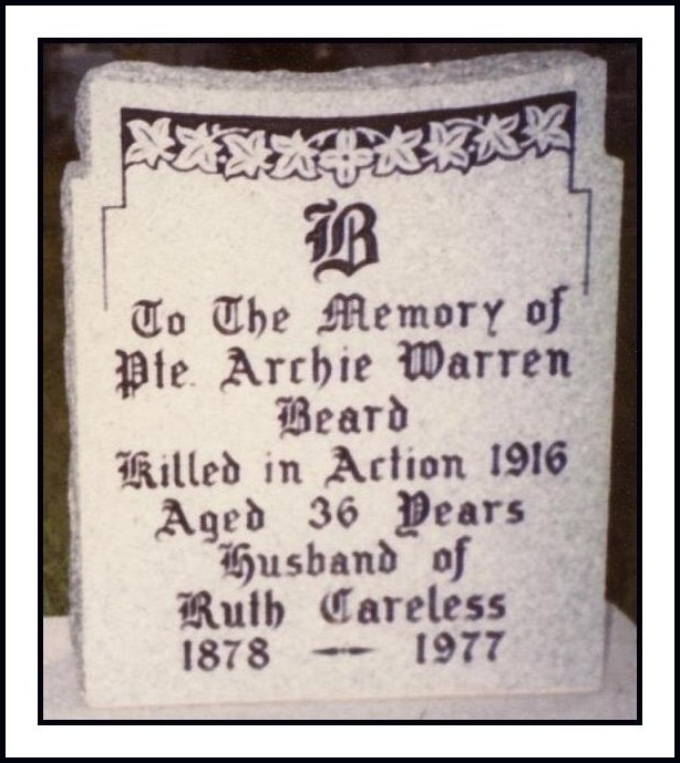 Archie Warren Beard was one of 600,000 Canadian colonials that served in the war but unfortunately he was also one of more than 60,000 Canadians killed in action in the first world war. Archie would never again see his wife Ruth, son Bill or daughters Vera and Mable or their children and families but Archie will always be dearly missed and loved by all who remember. On Nov 11 remember the sacrifice Archie and many others made for us all. |